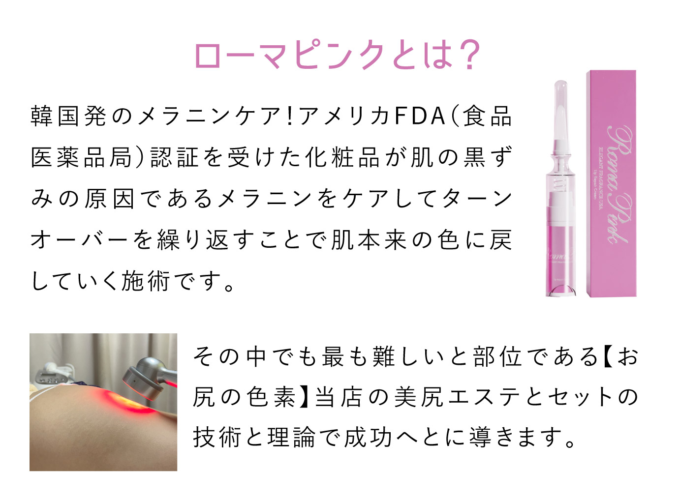 | 20代〜 | 黒ずみ、ニキビ、ざらつき、たるみ、セルライト、 ダイエットによる肉割れ、産後(たるみ、肉割れ)、 四角尻、たれ尻 |